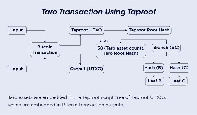 To enable quick, effective, private retrieval and modifications to the witness/transaction data and to demonstrate legitimate conservation/non-inflation, TARO utilizes a Merkle-Sum Tree and a Sparse-Merkle Tree. When put into a channel on the Lightning Network, assets can be moved via on-chain transactions.